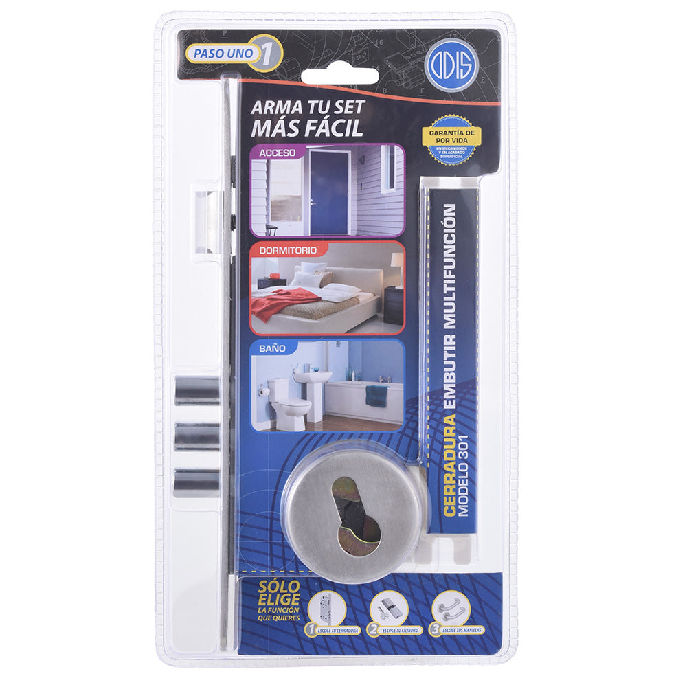 - Combínalo con otros productos de la línea Arma tu Set. Cerradura Embutir Odis 301 Multifunción- Para puertas de 35 a 50 mm de espesor- Backset de 45 mm- Cerrojo con 3 pitones de acero- NO incluye llave- Mecanismo doble vuelta de llave para todas las funciones excepto baño- Picaporte reversible de bronce cromado- Caja