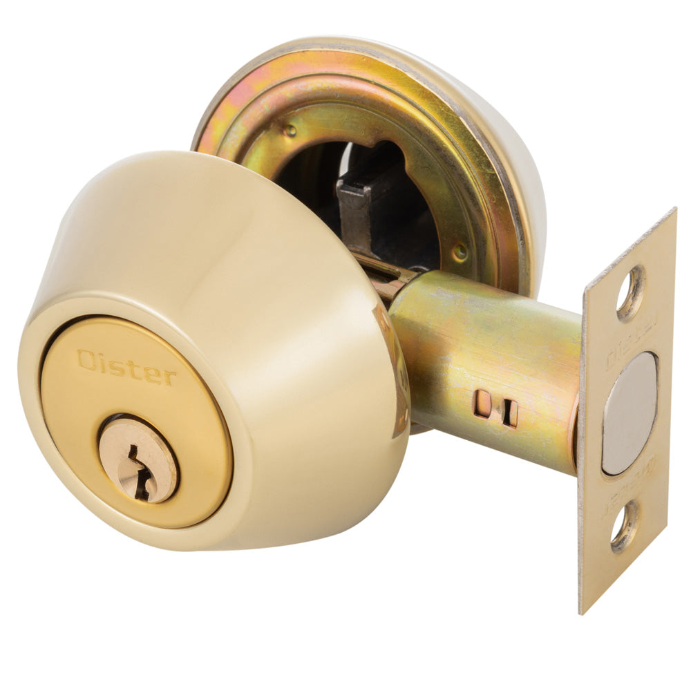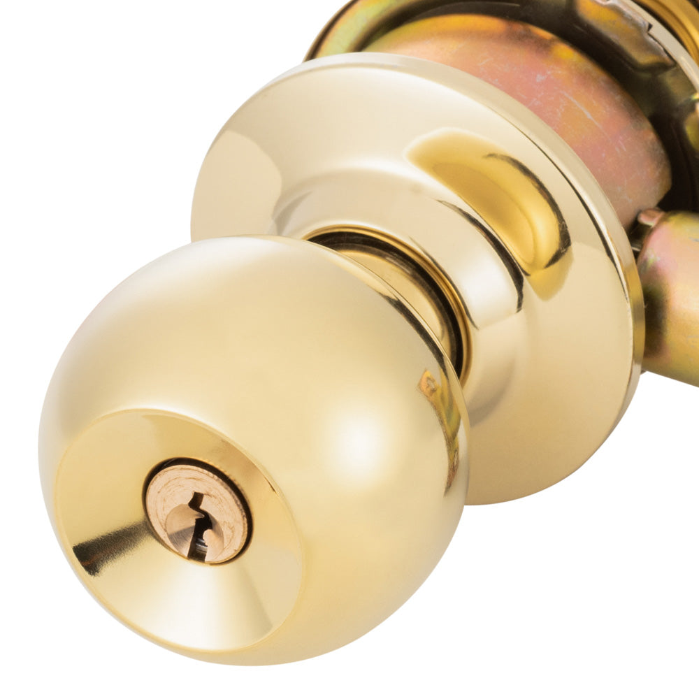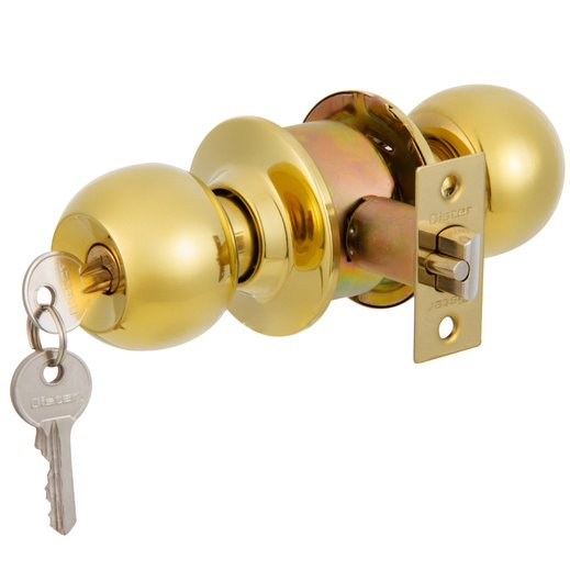 Cerradura cilíndrica de acceso bronce pulido- Backset 60mm- Para puertas de 35 a 55 mm de espesor- Pomo exterior con llave / Pomo interior libre- Frontal, pomo, contrafrontal y roceta de acero- Cilindro latón- Picaporte de zamak con pestillo de seguridad anti-tarjeta- Incluye recibidor plástico, 4 Tornillos #8 x 20mm,